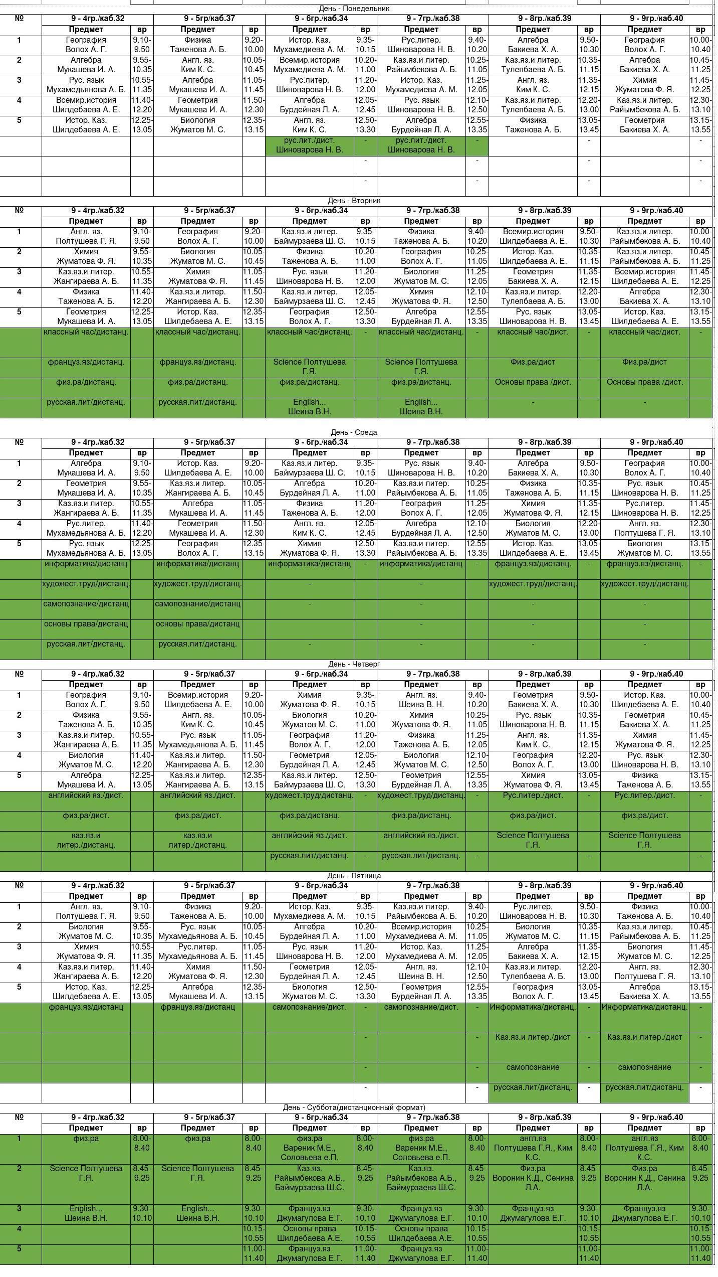 Расписание уроков обучения в комбинированном формате 9,11 классов – 70 % предметов в штатном режиме, 30 %– в дистанционном