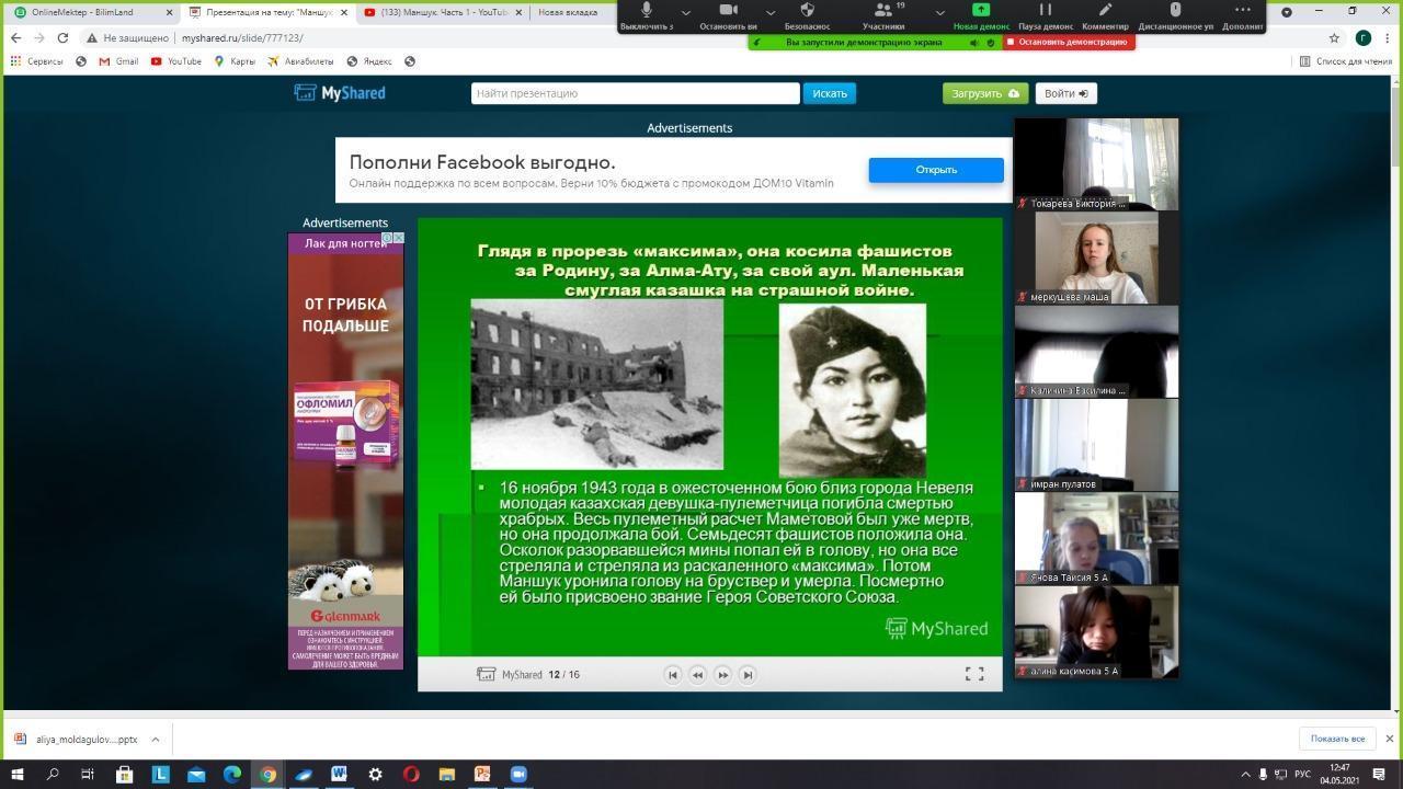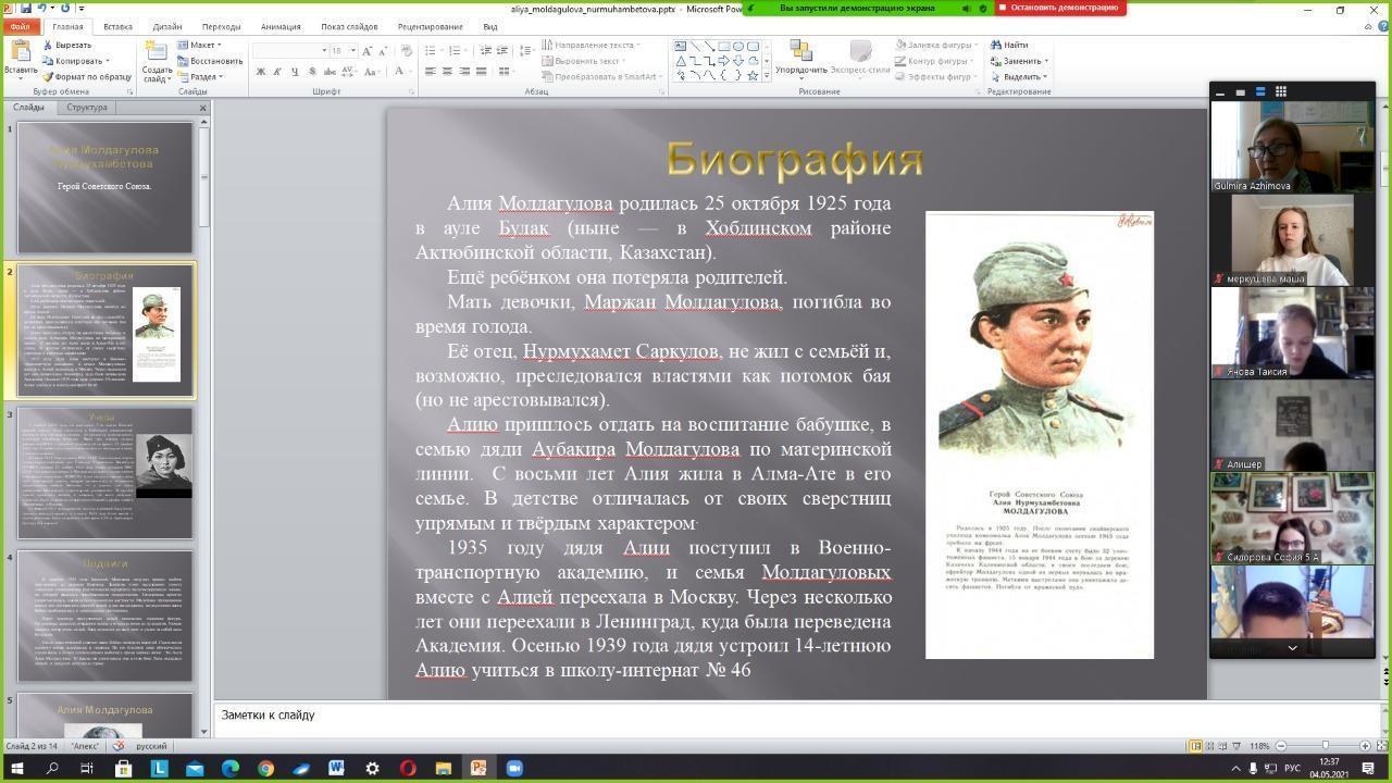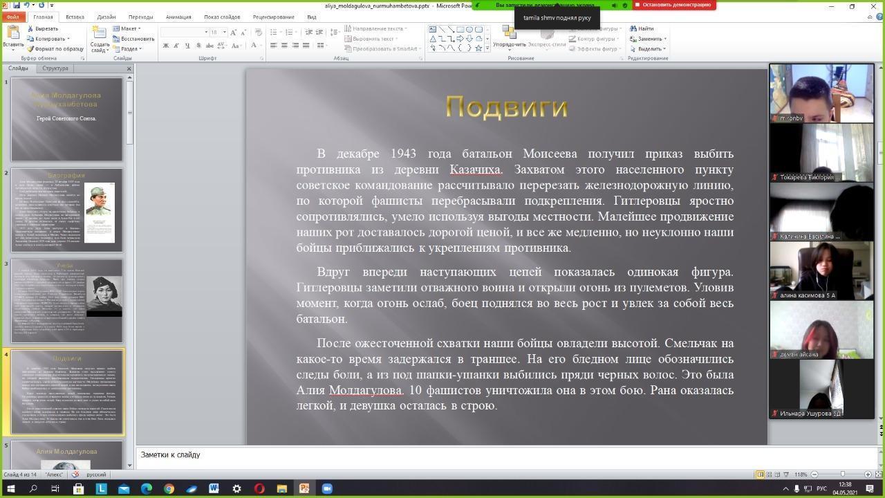 в КГУ «Гимназия № 132» проведено мероприятие для учащихся 5-х классов в режиме онлайн на тему: «Родину славят герои: бессмертный подвиг А.Молдагуловой, М.Маметовой, Х. Доспановой.