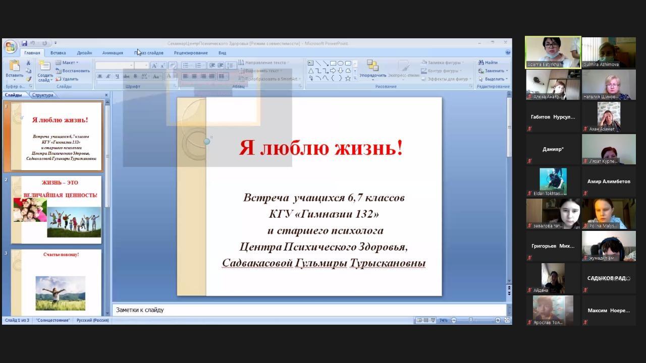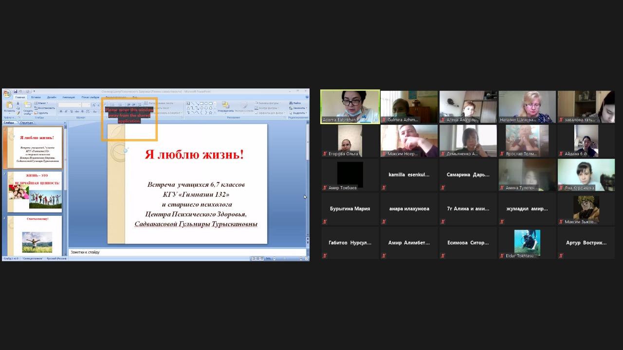 17.05.2021 года в КГУ «Гимназия № 132» проведена онлайн встреча со старшим психологом Центра Психического Здоровья Садвакасовой Г.Т. и учащимися 6-7 –х классов на тему : « Я люблю жизнь!»