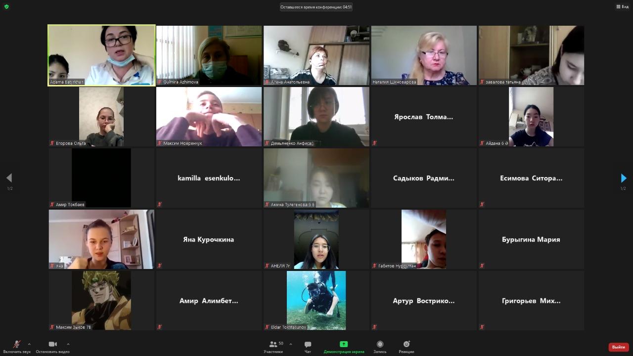 17.05.2021 жылы «No132 Гимназия» КММ-де Психикалық Денсаулық Орталығының аға психологы Г.Т. Садвакасовамен бірге 6-7 сынып оқушыларына «Мен өмірді сүйемін!» тақырыбында онлайн-кездесу өткізілді.