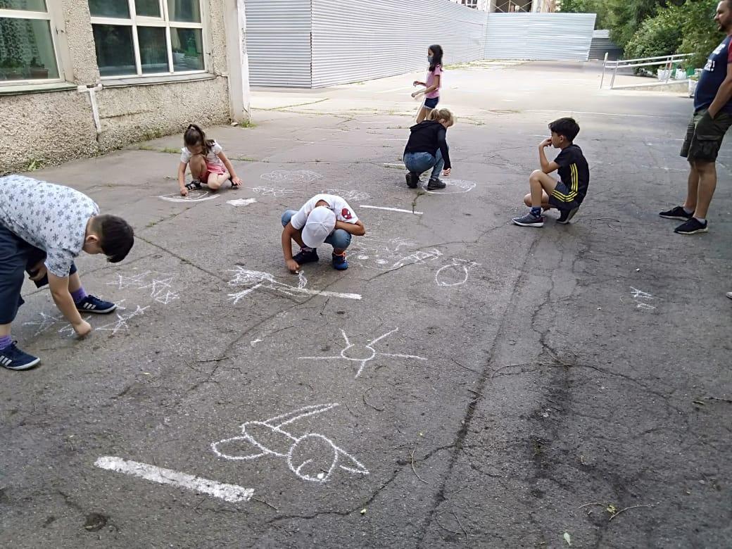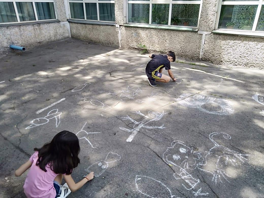 В летней школе КГУ "Гимназия № 132" проводился конкурс рисунков на асфальте, где дети могли показать свои эмоции и смелость.