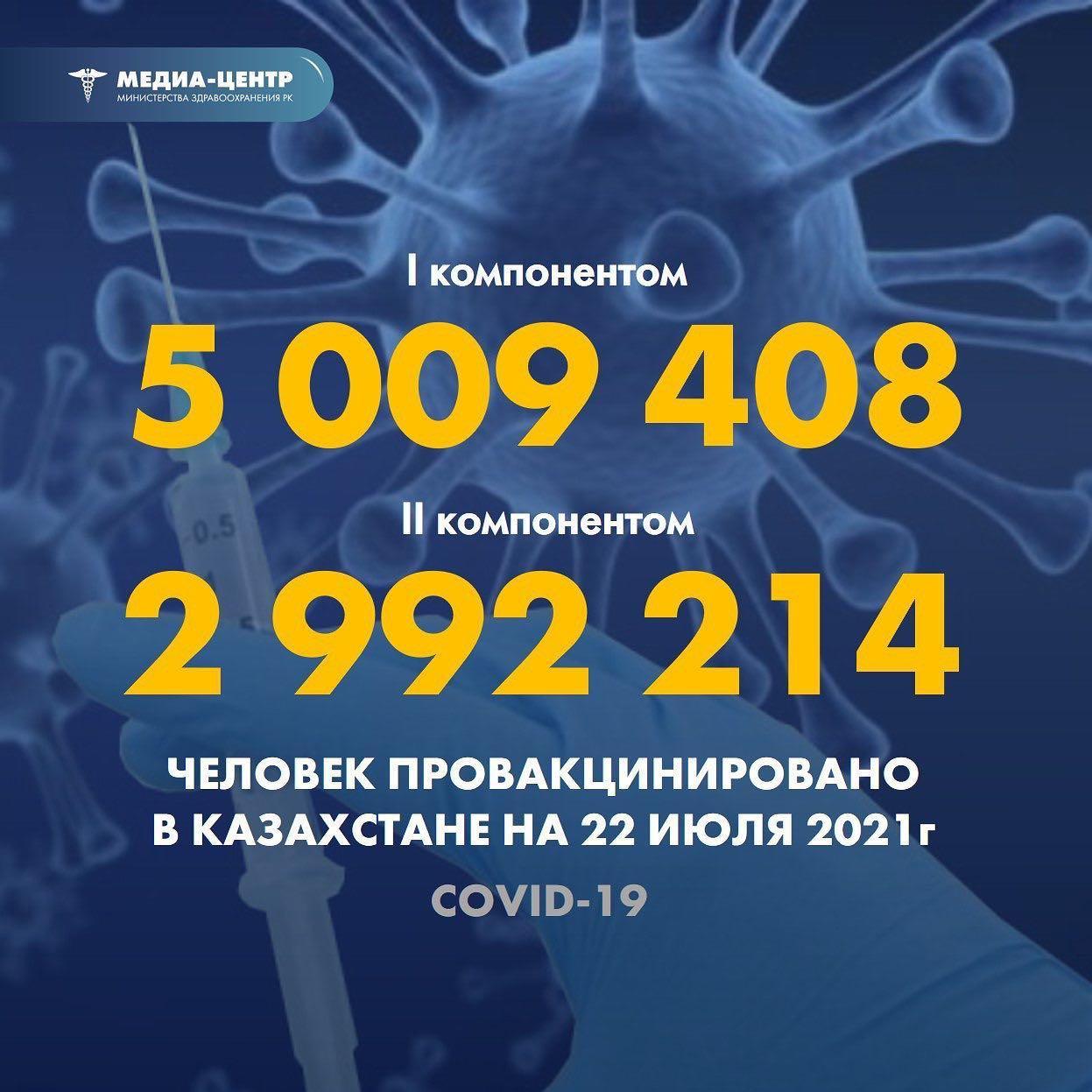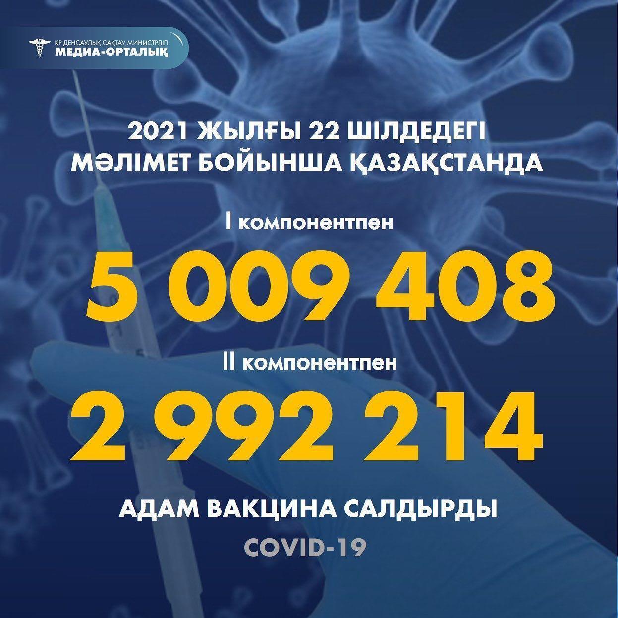 22 шілде 2021 0 1 2 3 4 5 Массовая вакцинация может остановить распространение КВИ 2021 жылғы 22 шілдедегі мәлімет бойынша Қазақстанда I компонентпен 5 009 408 адам вакцина салдырды, II компонентпен 2 992 214 адам.***I компонентом 5 009 408 человек провакцинировано в Казахстане на 22 июля 2021 г, II компонентом 2 992 214 человек Осы беттің QR-коды:QR-код этой страницы: