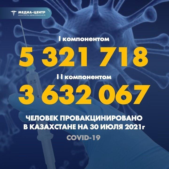 I компонентом 5 321 718 человек провакцинировано в Казахстане на 30 июля 2021 г, II компонентом 3 632 067 человек.