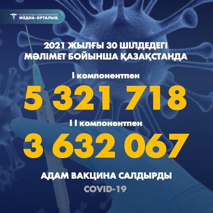 2021 жылғы 30 шілдедегі мәлімет бойынша Қазақстанда I компонентпен 5 321 718 адам вакцина салдырды, II компонентпен 3 632 067 адам.