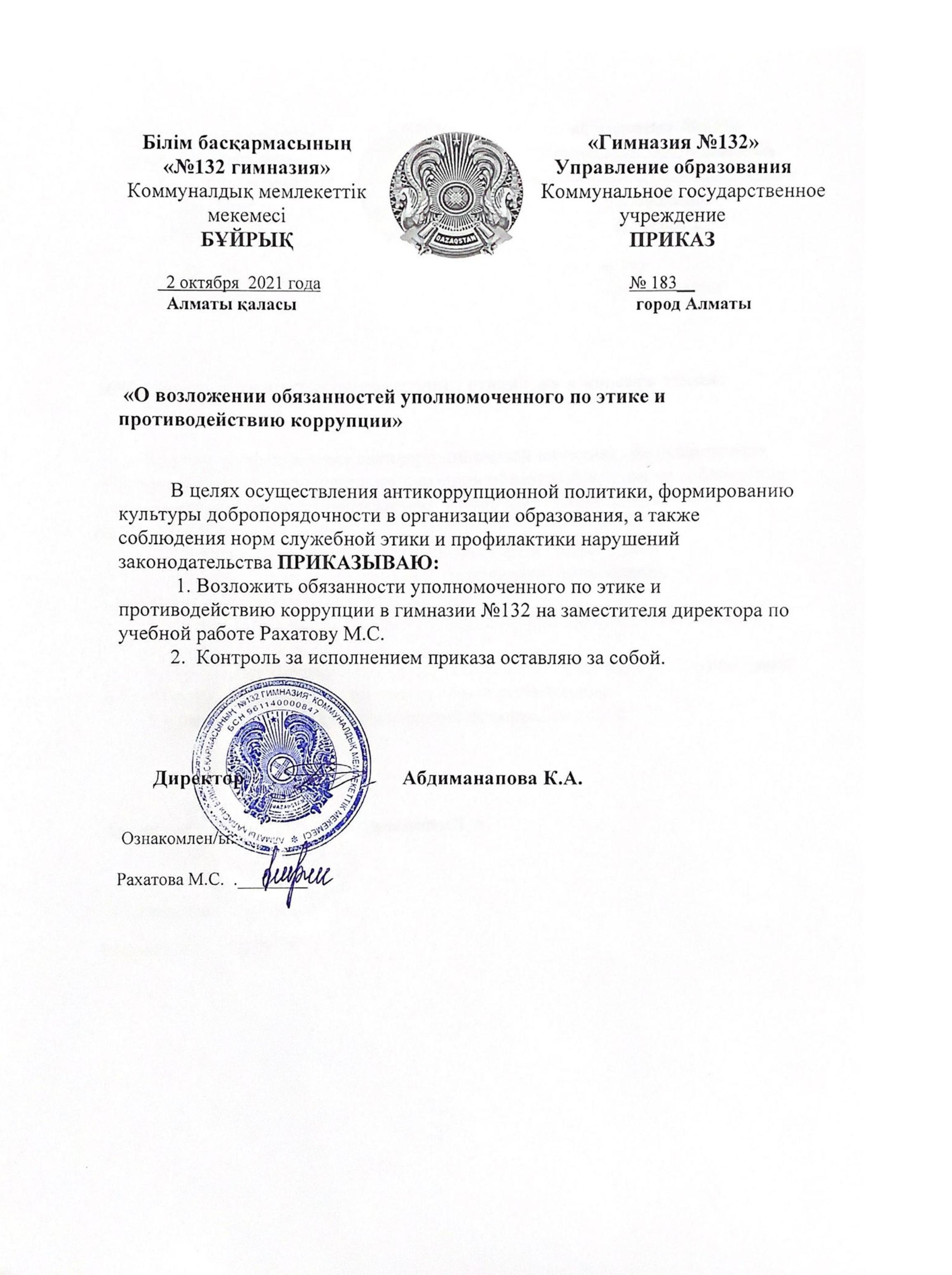 14 қазан 2021 0 1 2 3 4 5 Приказ " О вложении обязанностей уполномоченного по этике и противодействию коррупции" Осы беттің QR-коды:QR-код этой страницы: