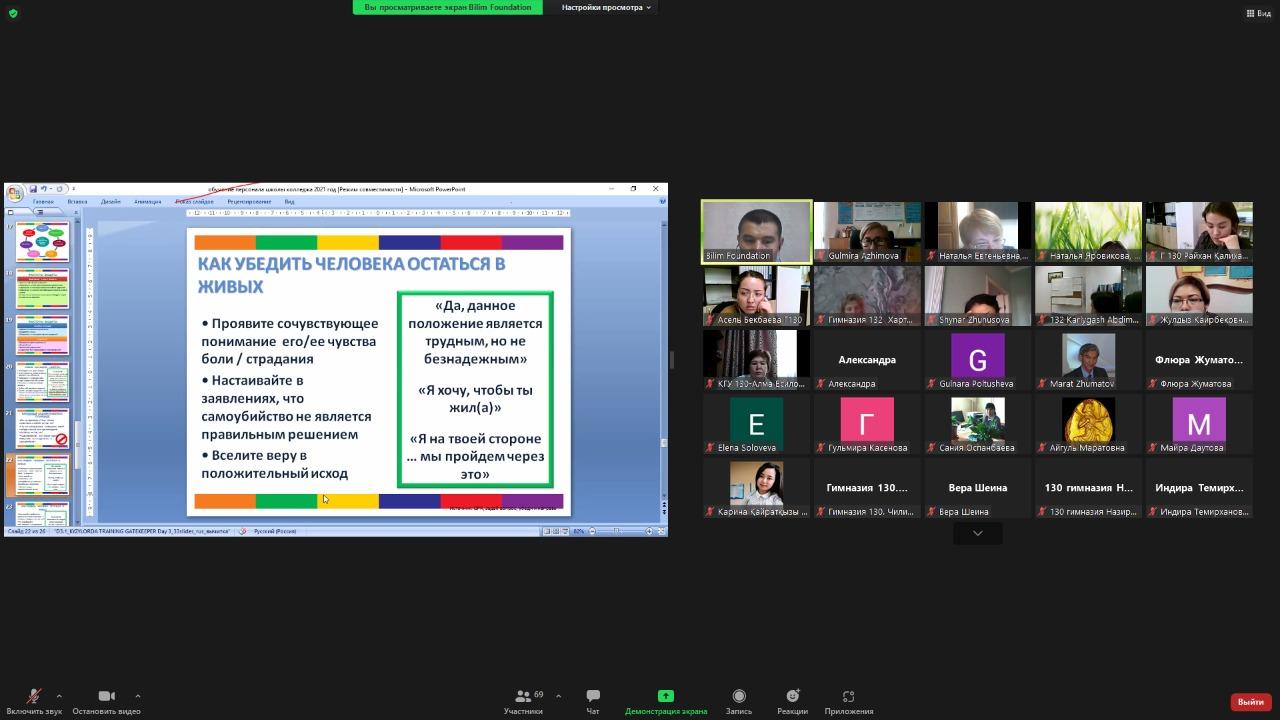 03.11.2021 №132 гимназияның педагогикалық ұжымы «Денсаулық пен өмірлік дағдыларды қалыптастыру, сонымен қатар кәмелетке толмағандар арасында суицидтің алдын алу» бағдарламасына сәйкес «Тағдыр сақшылары» тақырыбында мұғалімдерге арналған онлайн вебина