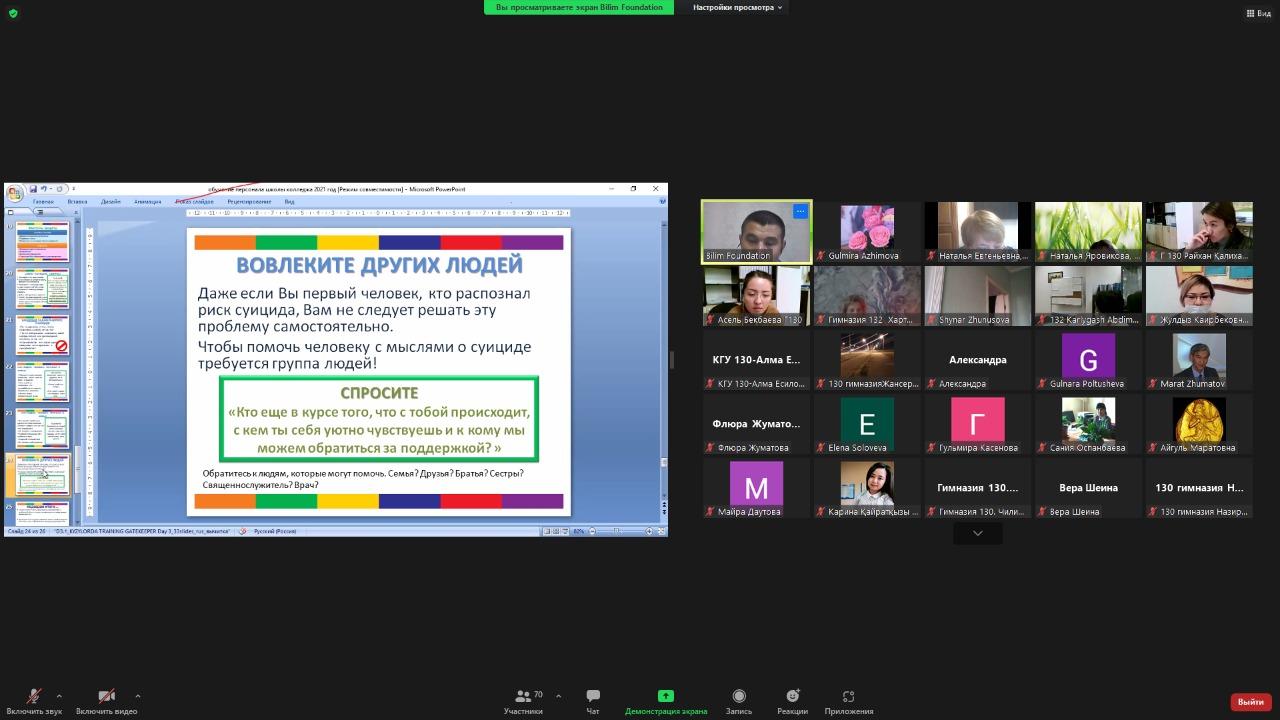 03.11.2021 №132 гимназияның педагогикалық ұжымы «Денсаулық пен өмірлік дағдыларды қалыптастыру, сонымен қатар кәмелетке толмағандар арасында суицидтің алдын алу» бағдарламасына сәйкес «Тағдыр сақшылары» тақырыбында мұғалімдерге арналған онлайн вебинарға қатысты.