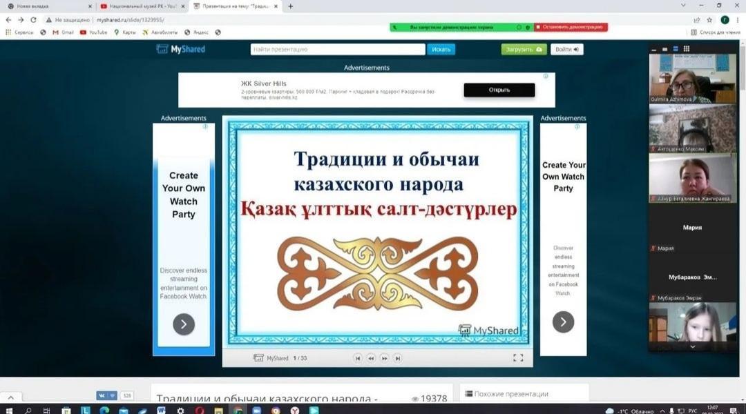 08.02.2022 г для учащихся 5-х классов проведена беседа о традициях и обрядах казахского народа и онлайн-экскурсия в Национальный музей Республики Казахстан.