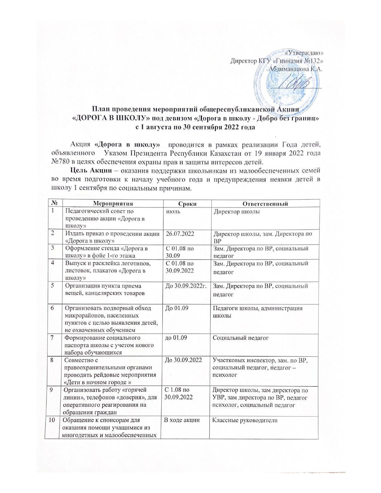 КГУ "Гимназия №132" » Ақпарат » План проведения мероприятий общереспубликанской Акции «ДОРОГА В ШКОЛУ» под девизом «Дорога в школу - Добро без границ» с 1 августа по 30 сентября 2022 года