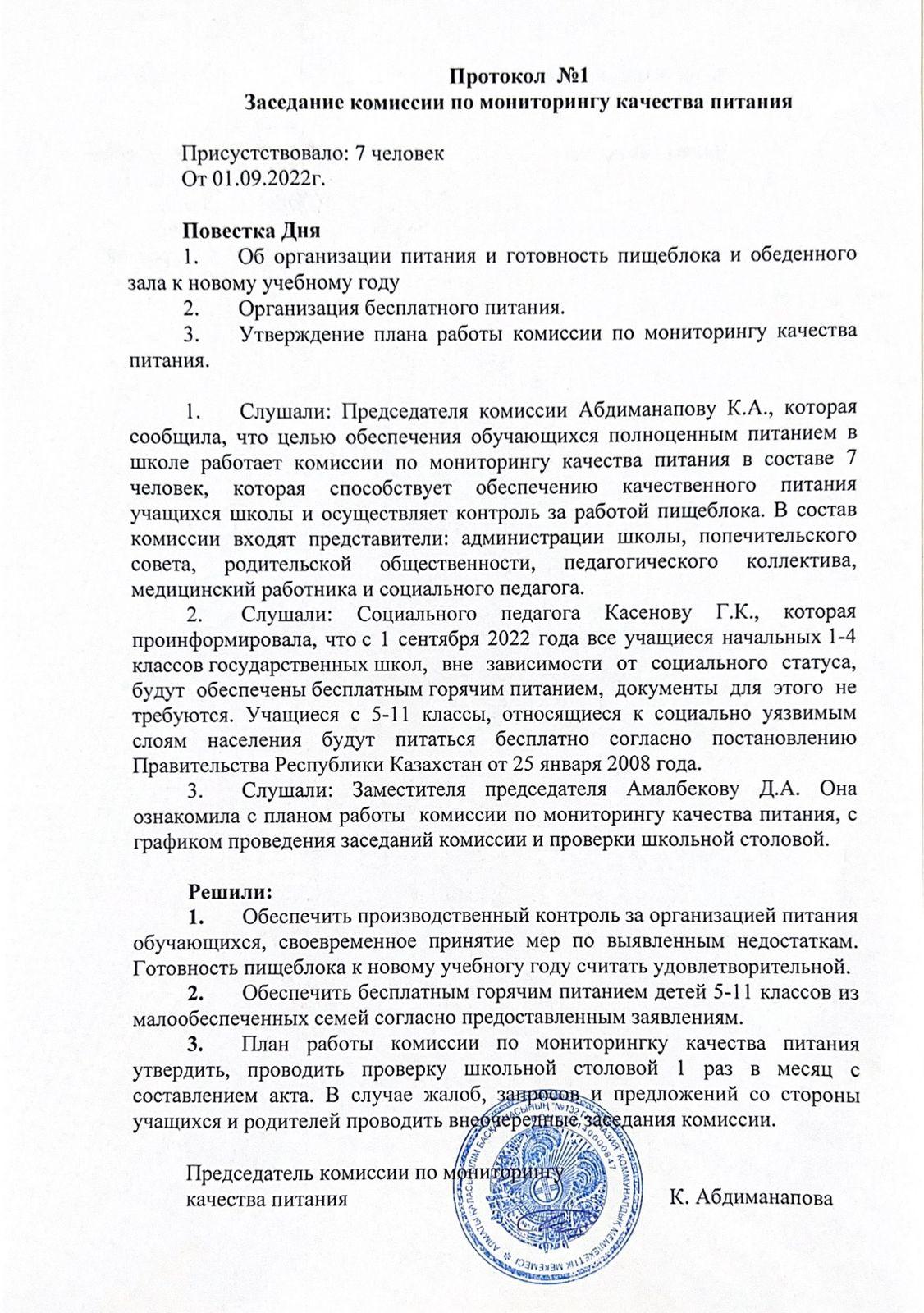 01 қыркүйек 2022 0 1 2 3 4 5 Тамақтану сапасын мониторингілеу жөніндегі комиссия отырысының №1 хаттамасы Протокол №1 заседания комиссии по мониторингу качества питания Осы беттің QR-коды:QR-код этой страницы: