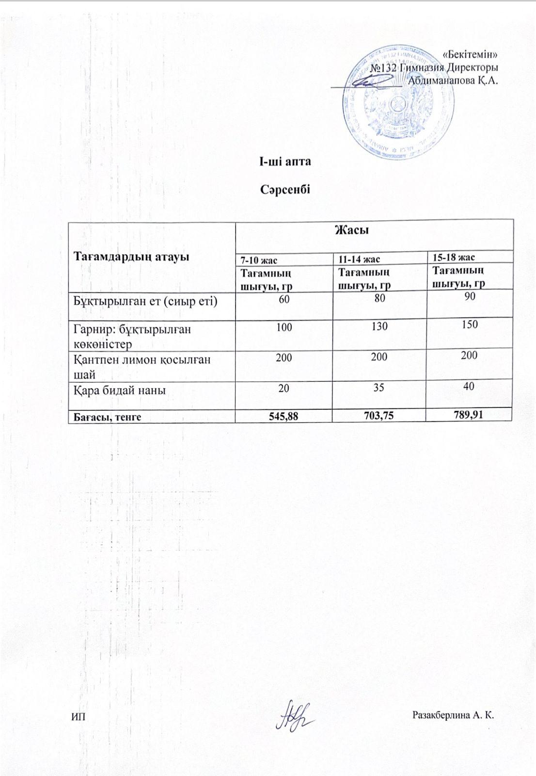 Ас мәзірі 1 апта 1 күн