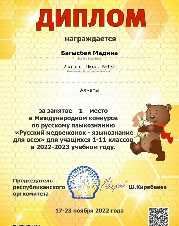 КГУ "Гимназия №132" » Ақпарат » 2 «Ә» сынып оқушысы Бағысбай Мадина 2022-2023 оқу жылында 1-11 сынып оқушылары арасында өткен «Русский медведь - лингвистика всех» атты халықаралық орыс тіл білімі байқауында 1 орынға ие болды.