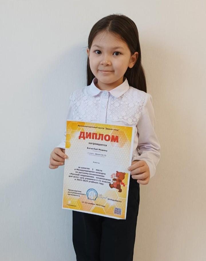2 «Ә» сынып оқушысы Бағысбай Мадина 2022-2023 оқу жылында 1-11 сынып оқушылары арасында өткен «Русский медведь - лингвистика всех» атты халықаралық орыс тіл білімі байқауында 1 орынға ие болды.