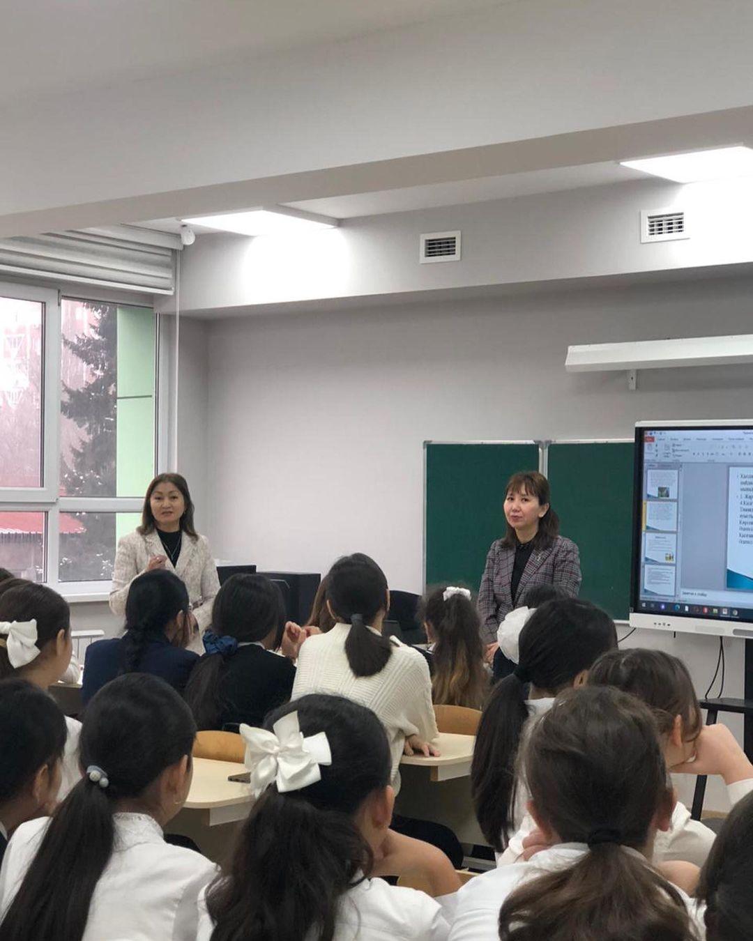 Қазақ тілінде оқытылатын 5-8 сынып оқушыларымен "Қазақ қызы әдемі" тақырыбында қыздармен сырласу, пікір алмасу болды. Ұйымдастырушылар: директордың оқу ісі жөніндегі орынбасары Д. Амалбекова және педагог ұйымдастырушы Ж. Тлепбергенова
