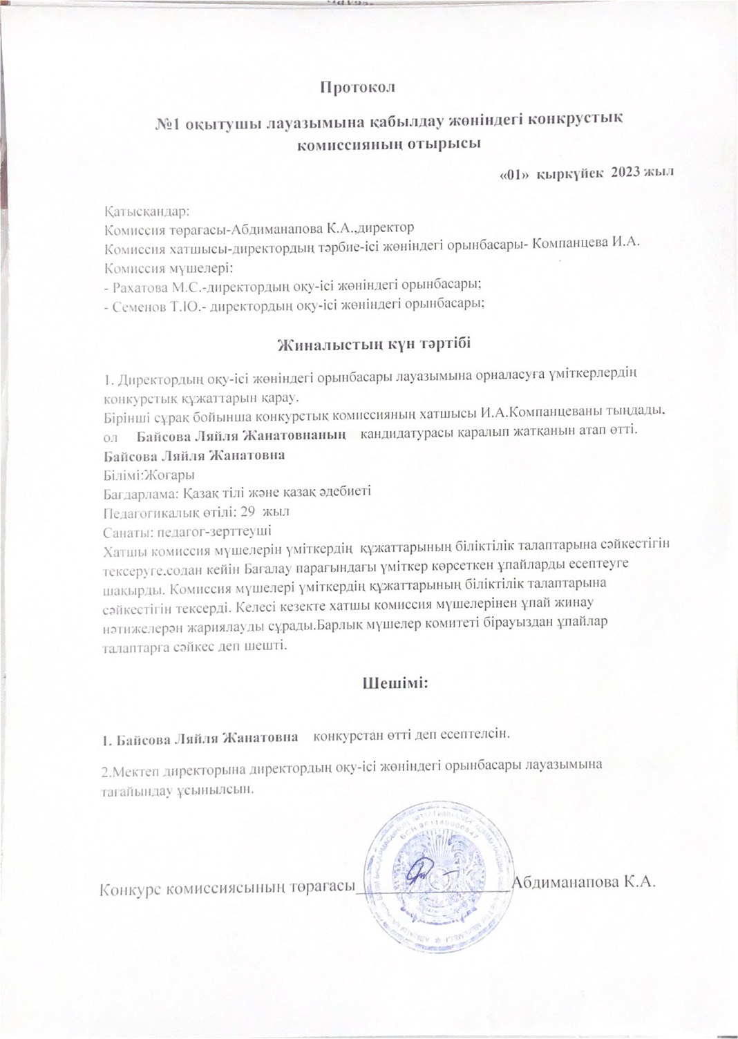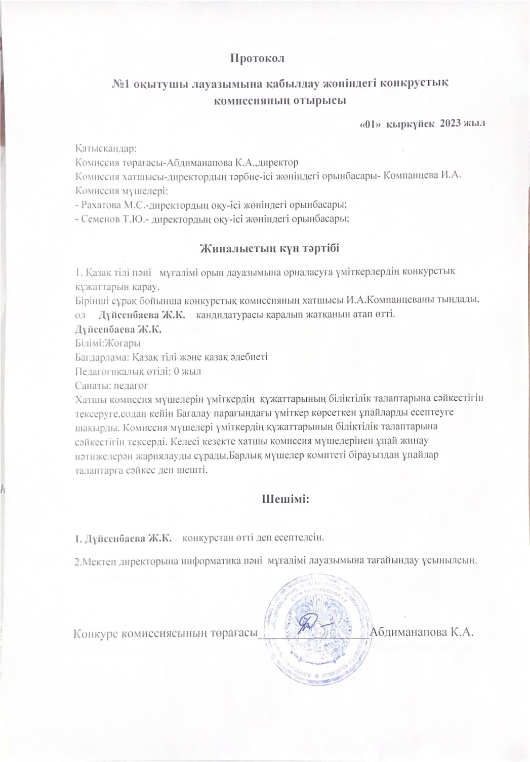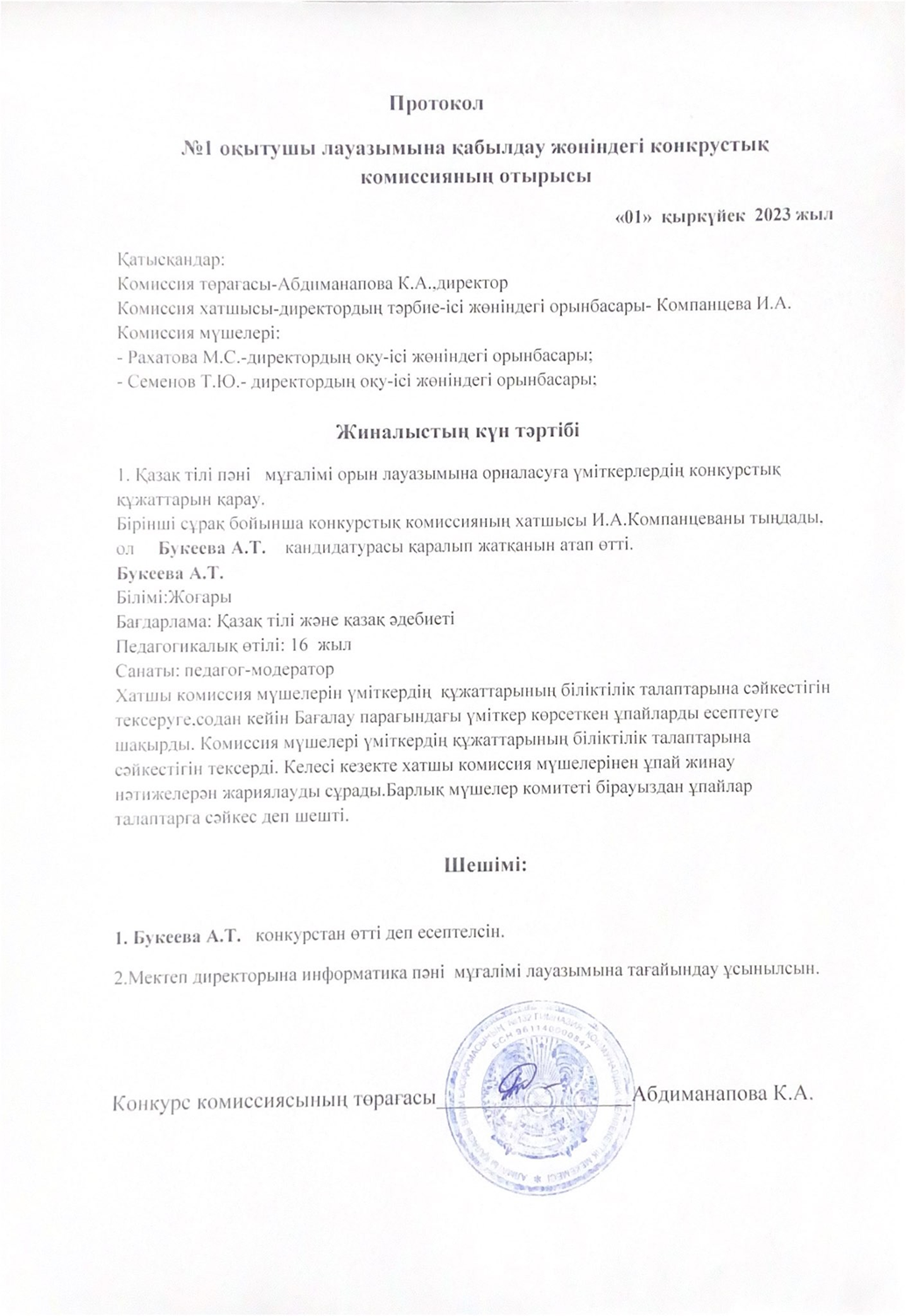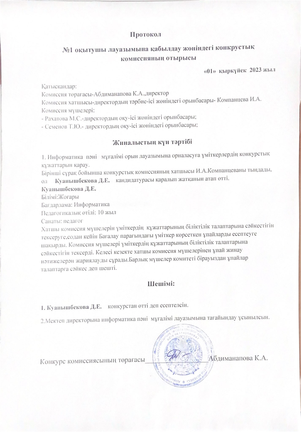01 қыркүйек 2023 0 1 2 3 4 5 №1 оқытушы лауазымына қабылдау жөніндегі конкрустық комиссияның отырысы жөніндегі хаттама Осы беттің QR-коды:QR-код этой страницы: