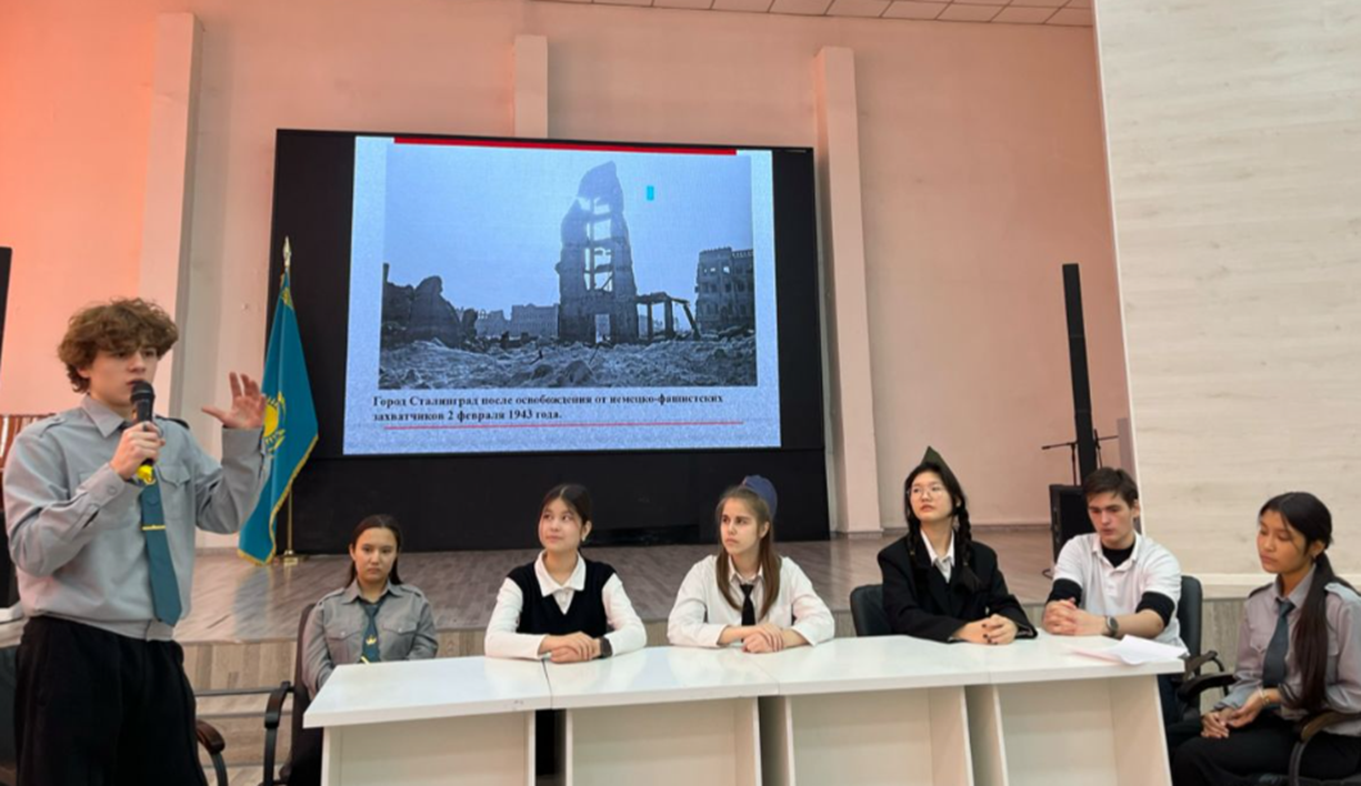 13.02.2025 г в рамках празднования 80-летия Дня Победы и памятных дат, был проведен круглый стол среди 10,9,8 классов на тему " День разгрома советскими войсками немецко-фашистских войск в Сталинградской битве 17 июля 1942 г- 2 февраля 1943 г ". Зрители и участники круглого стола узнали о значимости Сталинградской битвы как коренного перелома Второй мировой войны и вспомнили героев-казахстанцев этой битвы : Спатаев Карсыбай , Тимофей Позолотин, Нуркен Абдиров, Гаяз Рамаев. Подготовили мероприятие учителя истории Истыбаева Б.М. и Мухамедиева А.М.