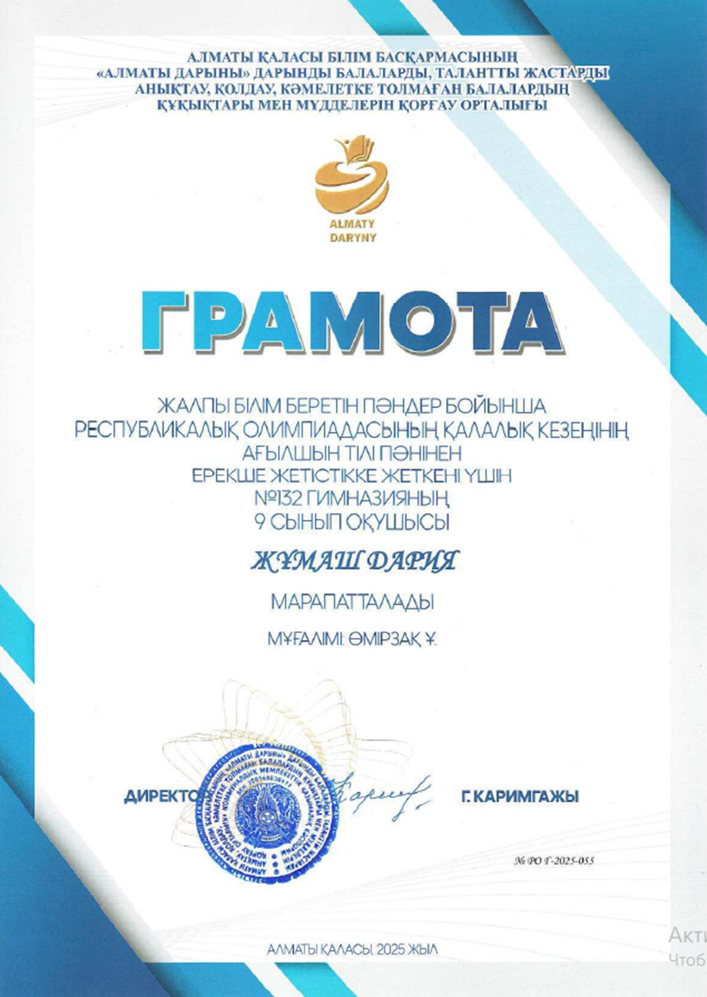 Жұмаш Дария (9 класс) – награждена грамотой (руководитель: Өмірзақ Ұлбала).