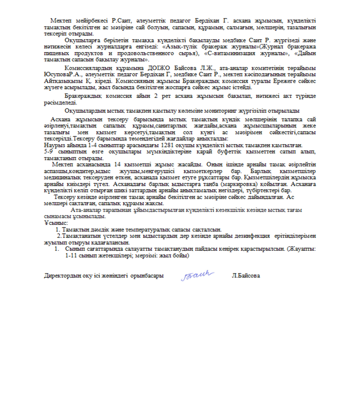 КГУ "Гимназия №132" » Тамақтандыру » Қызметтерді сатып алу жоспары » Жалпыға бірдей білім беру қорының қаражаты есебінен әлеуметтік қорғалмаған отбасылардан шыққан оқушылардың тегін ыстық тамақтануын ұйымдастыруды бақылау туралы науырыз айына анықтама