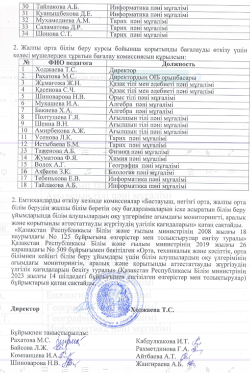 Негізгі орта және жалпы орта білім беру курсы бойынша қорытынды аттестаттауды өткізу үшін аттестаттау комиссиясын құру туралы бұйрық